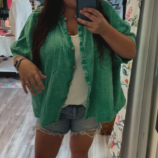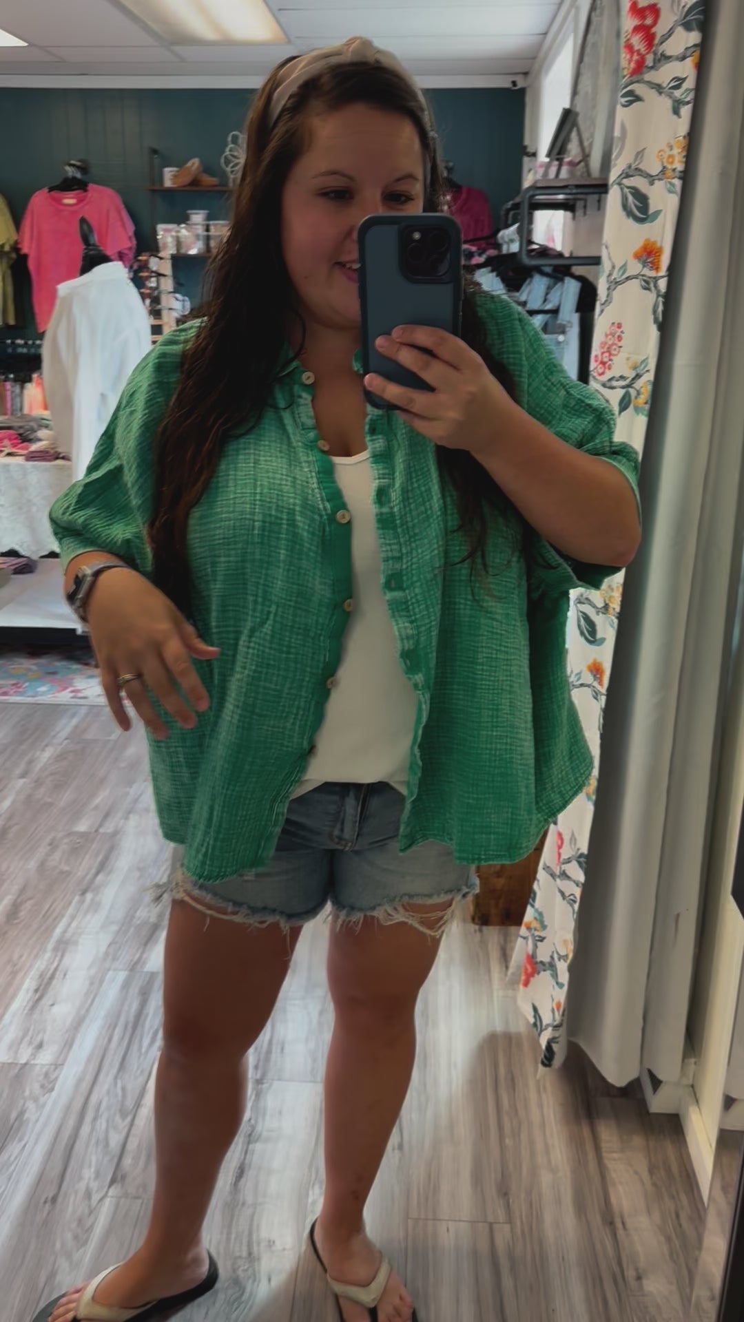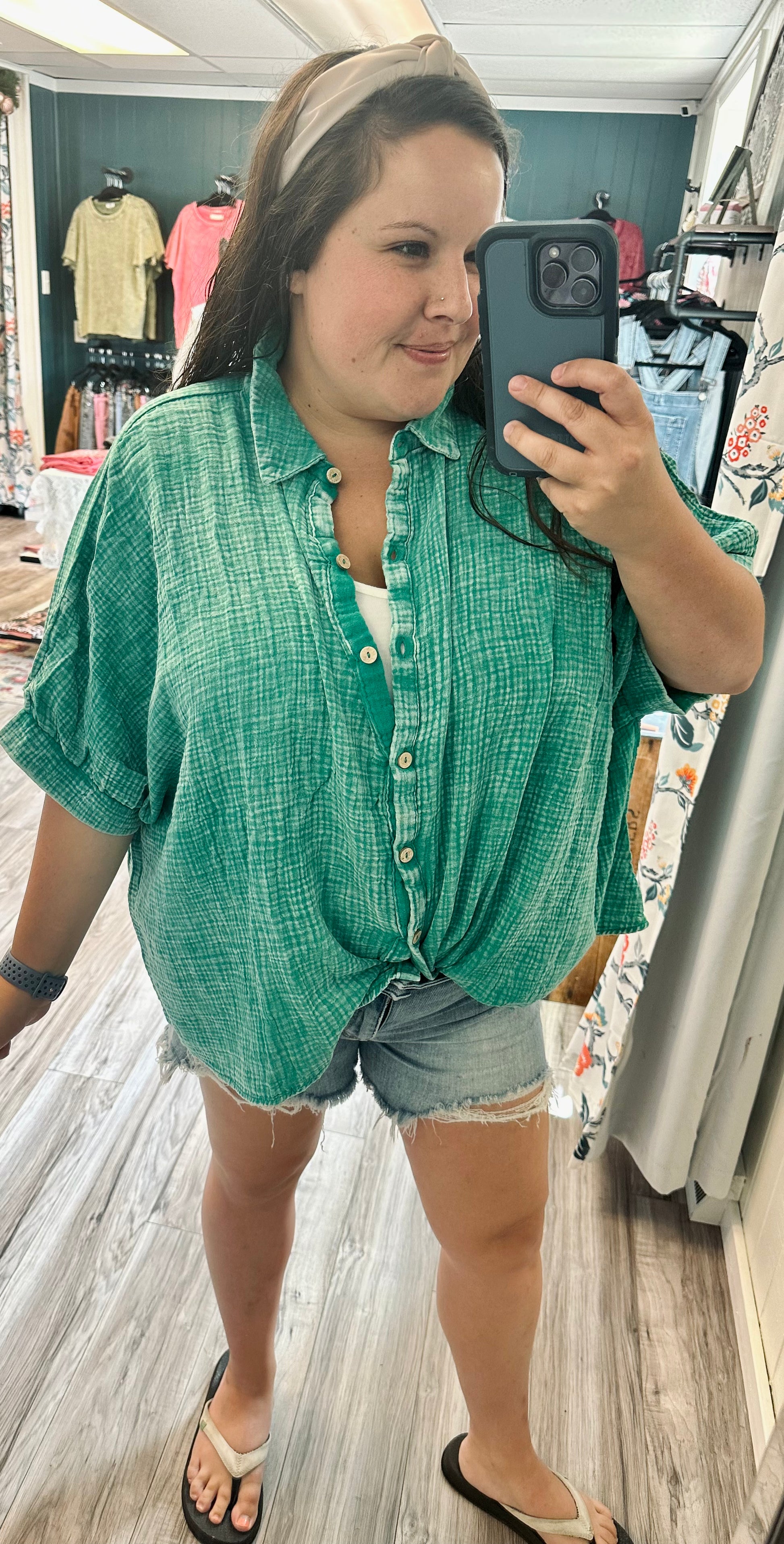 Expertly crafted with lightweight, breezy gauze fabric, our Gone with the Wind gauze top offers a versatile and oversized fit. Its mineral wash adds a touch of texture, making it a perfect choice for dressing up or down. Leave it buttoned or unbuttoned over a tank for a chic look.