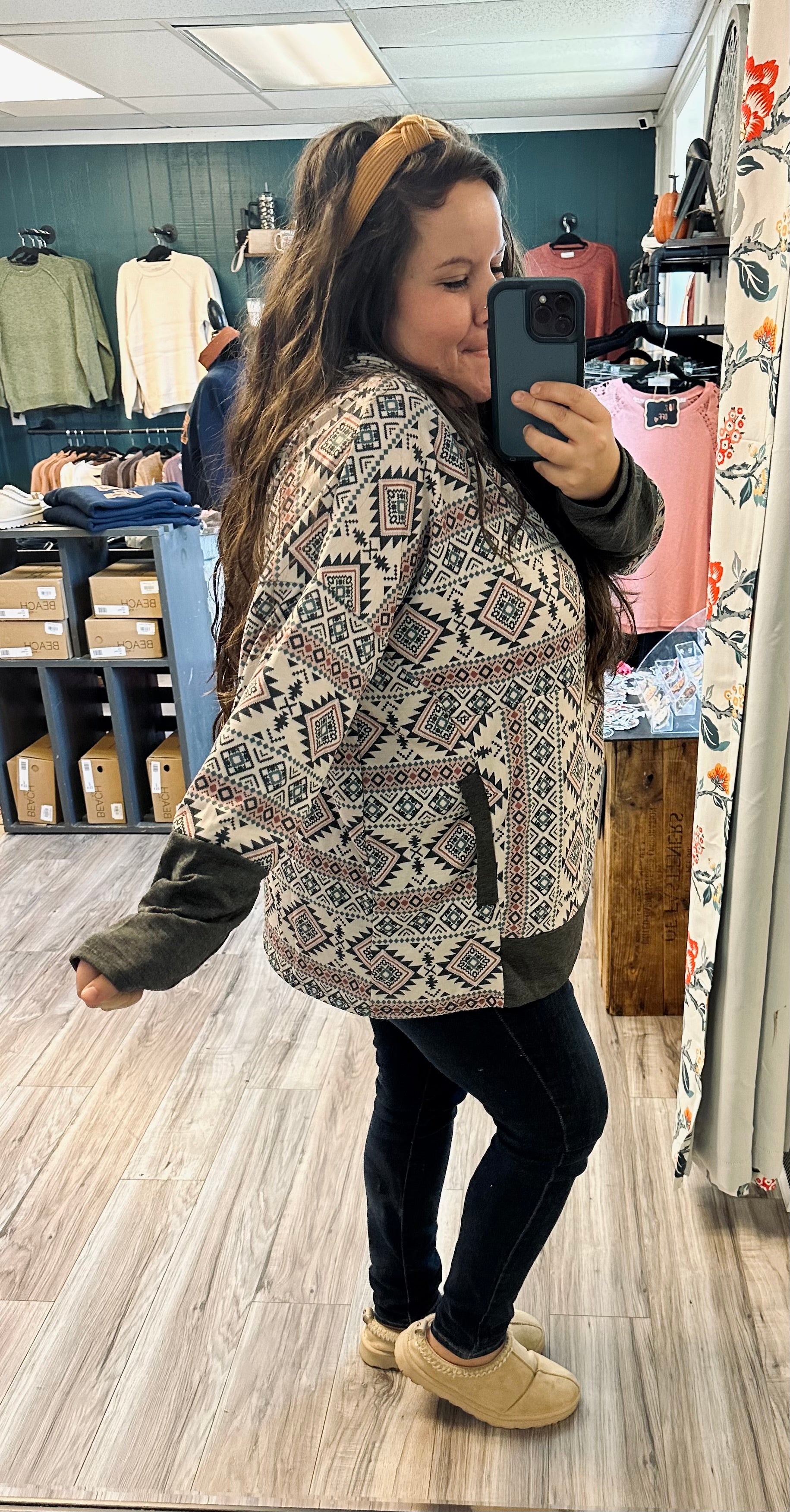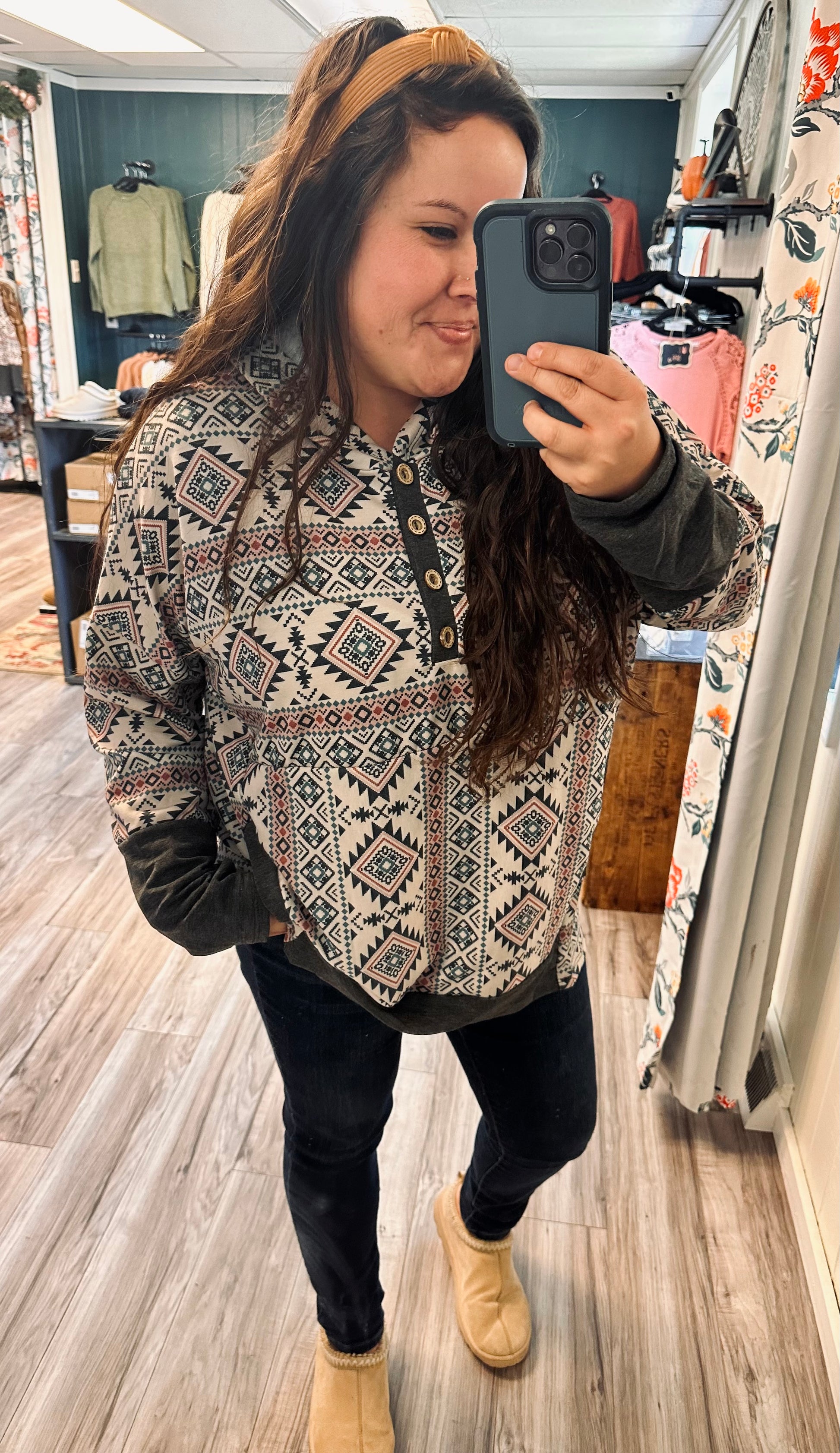Stay warm and stylish with our Lightweight Aztec pullover! With its colorful Aztec pattern and oversized fit, this hooded pullover will make you stand out in the crowd. The side pockets are perfect for keeping your hands warm, and its lightweight design ensures maximum comfort. Perfect for any occasion!