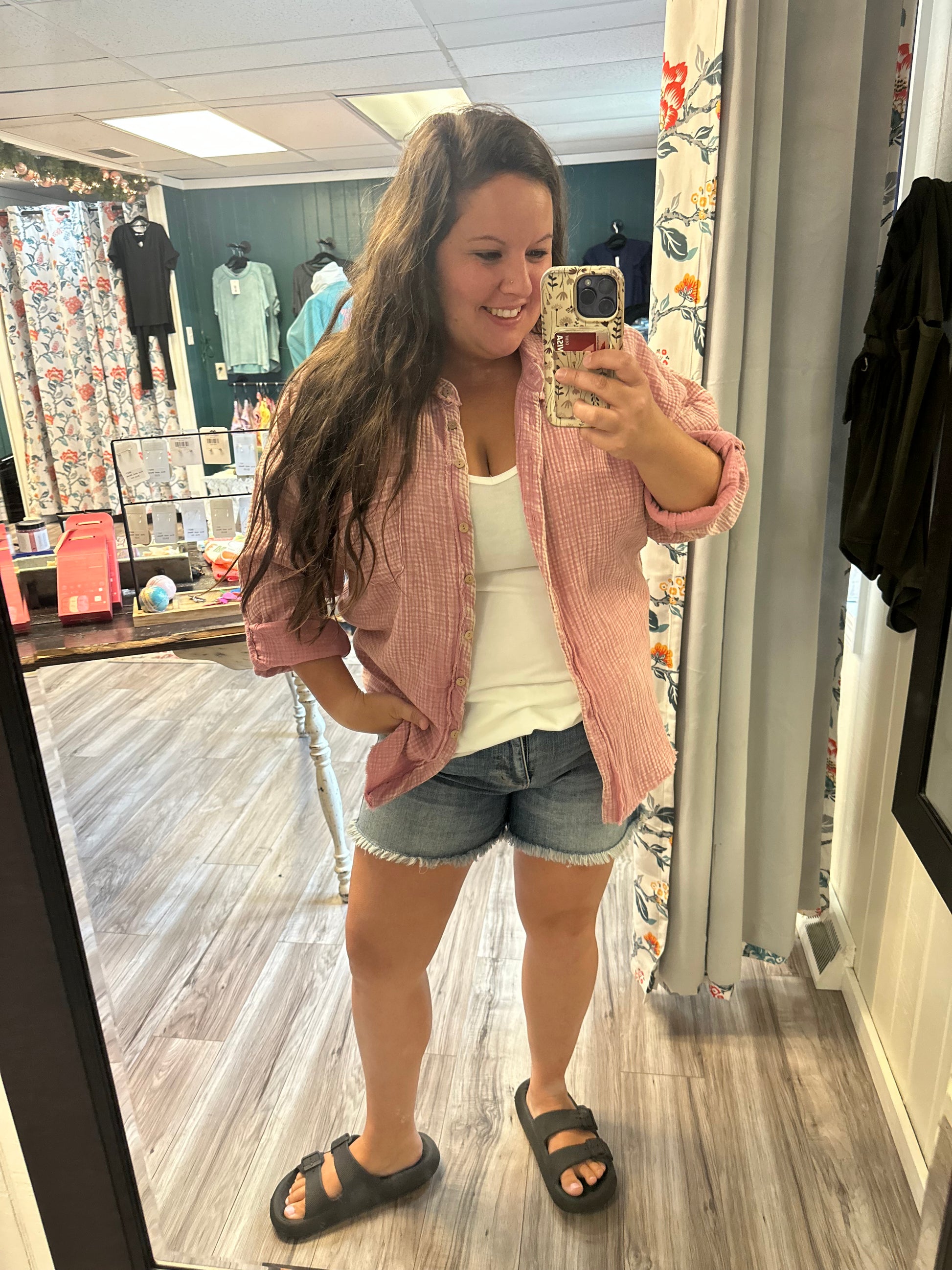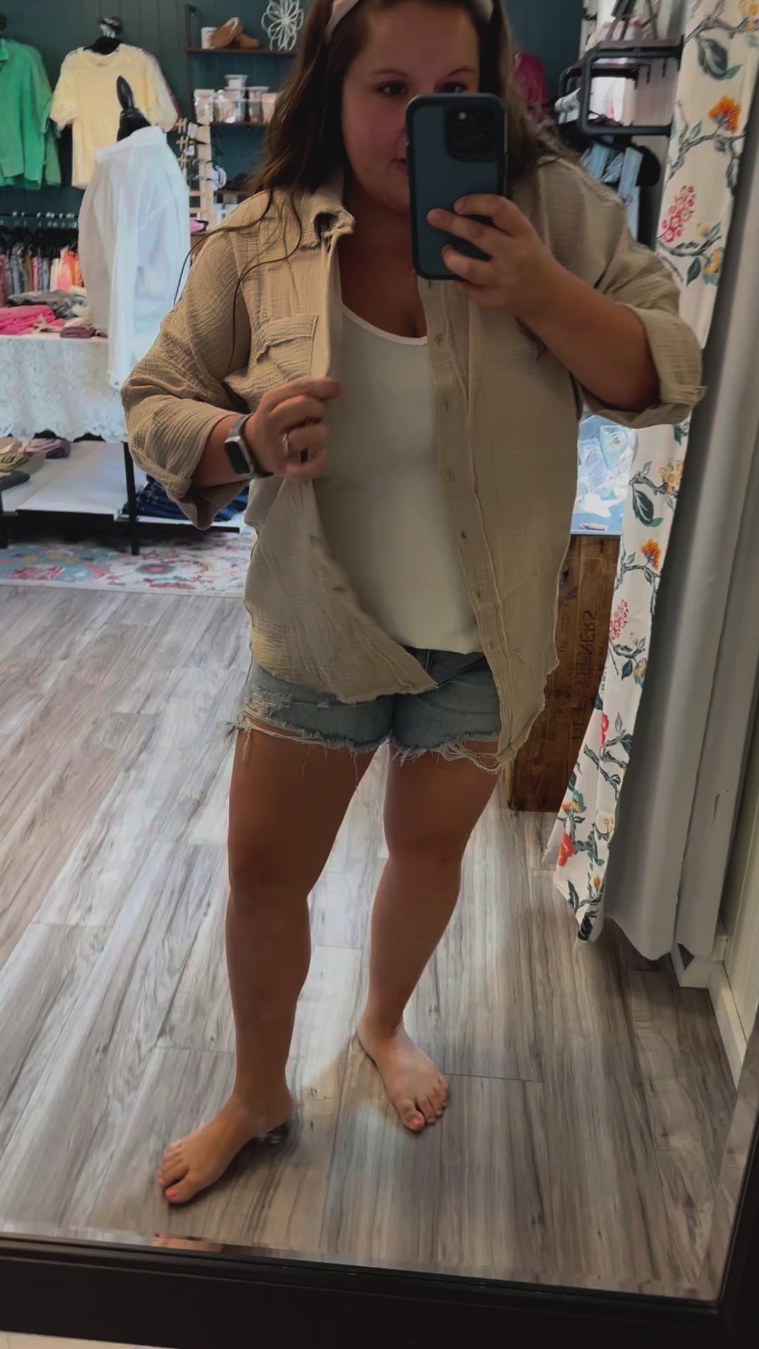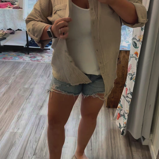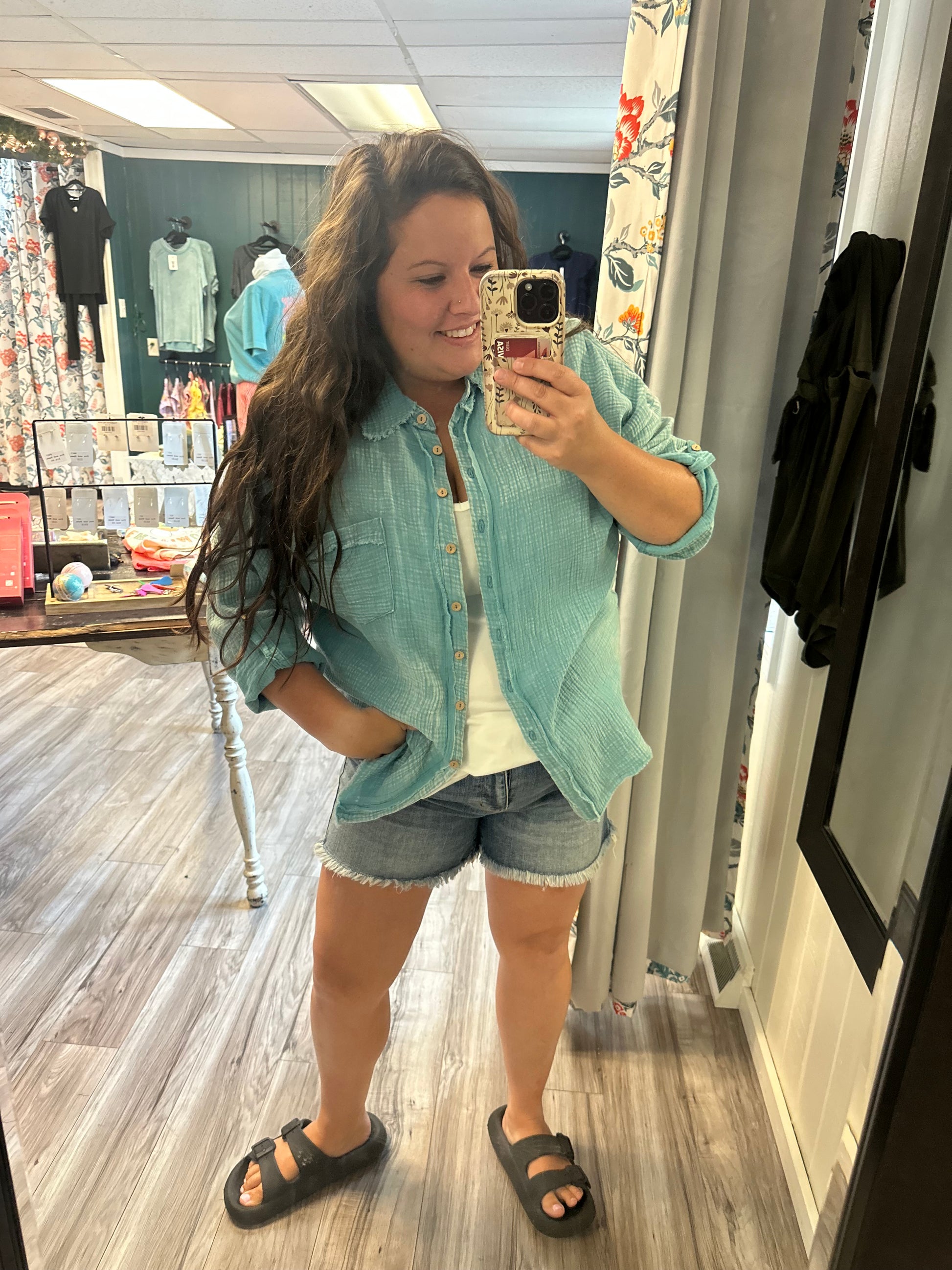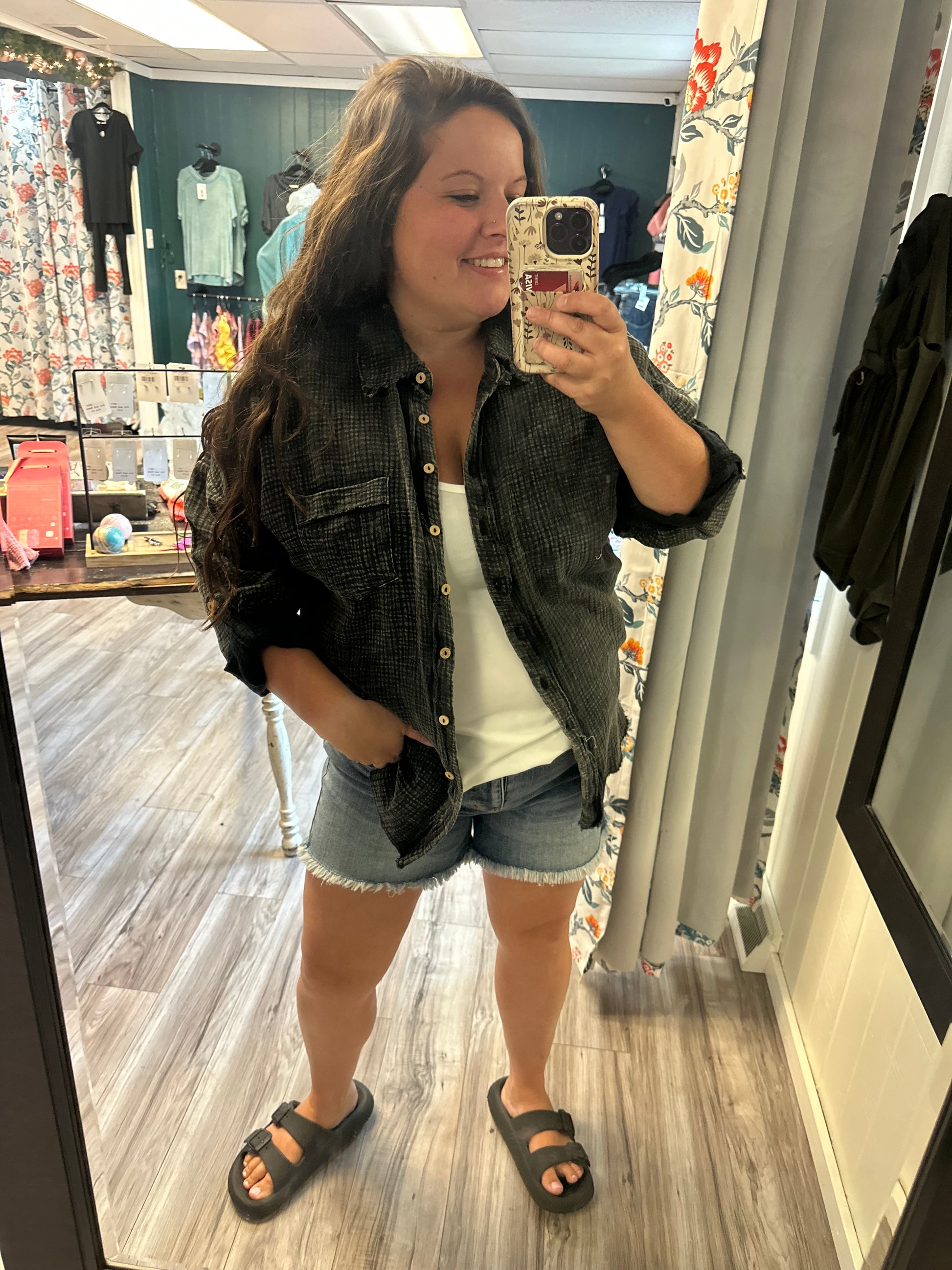 This washed out gauze button up combines a vintage mineral wash color with an oversized fit for a stylish and comfortable look. The fan favorite is now available in new colors, making it perfect for dressing up or keeping it casual.